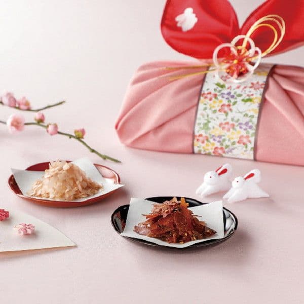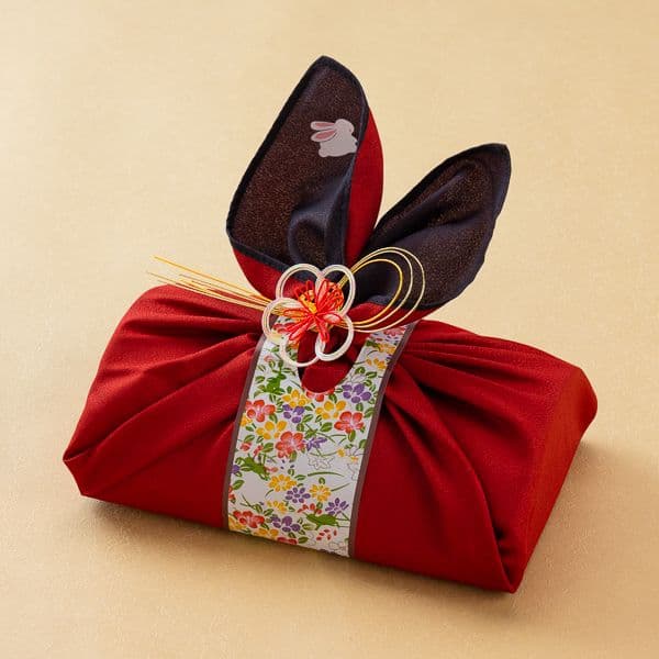 縁起のいいウサギをモチーフにした風呂敷で、結び目がウサギの長い耳のように見えるかわいらしいギフト。中身は焼津産の鰹節、ふりかけ。たまごスープです。存在感がある見た目ですが、とても軽く、縁起物として大人気の商品です。