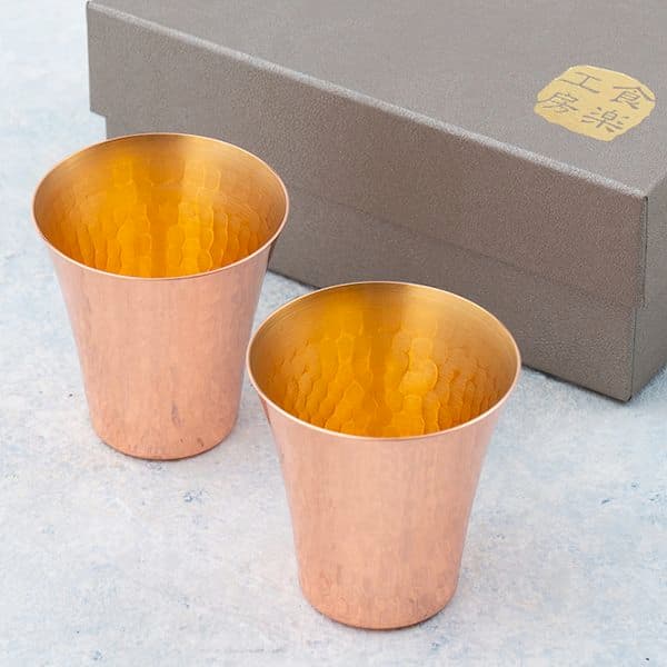 熱伝導率の高い銅製のため、冷たい飲み物を注げば、ひんやりと心地よい清涼感が伝わり、まろやかな口当たりに。冷酒はもちろんビールにもあうカップは、お酒好きのゲストにオススメの記念品です。